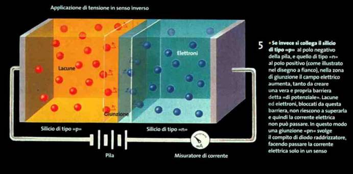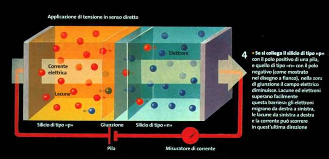 Ponendo due giunzioni p-n a breve distanza si può realizzare un dispositivo che emula in qualche modo il comportamento del triodo a vuoto, che costituisce la base di circuiti amplificatori e di micro-interruttori; questo dispositivo prende il nome di transistor bipolare. Il transistor bipolare è composto da una sottile regione n inserita tra due regioni p. La regione intermedia n viene chiamata base del transistor, mentre le due regioni p vengono chiamate rispettivamente emettitore e collettore. La concentrazione di lacune nell'emettitore è maggiore della concentrazione di elettroni nella base. Se applichiamo una piccola d.d.p. tra emettitore e base in polarizzazione diretta, e una d.d.p. maggiore tra base e collettore in polarizzazione inversa, abbiamo un flusso di elettroni dalla base all'emettitore e un flusso di lacune tra l'emettitore e la base, mentre fra base e collettore non vi è passaggio di elettroni né di lacune. ( per la spiegazione di questo fenomeno rifarsi alle figure precedenti ). Tuttavia, se la base è sufficientemente sottile, nell'ordine di qualche micrometro, le lacune che vi penetrano dall'emettitore possono giungere alla seconda giunzione prima di ricombinarsi: qui passano facilmente al collettore. Quindi una piccola d.d.p. fra emettitore e base può controllare una consistente corrente fra emettitore e collettore, proprio come nel triodo a vuoto avveniva con una piccola d.d.p. tra la griglia e il catodo. Però il transistor presentava molti vantaggi rispetto alla valvola, tra i quali abbiamo: