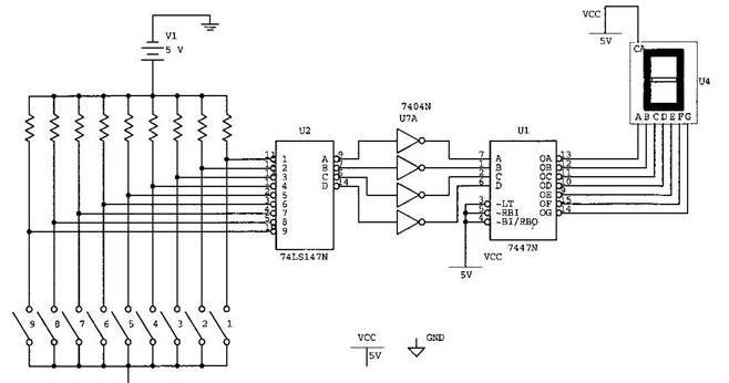 L'ingresso al circuito è fornito da 9 fili che fungo da interruttori. L'encoder (integrato 74147) si attiva con livello basso e quindi si collega a massa il filo corrispondente al numero che si vuole visualizzare. Poi il numero viene convertito in binario dall'encoder e all'uscita viene negato. Dato che il decoder ha bisogno di un segnale a livello alto è necessario usare l' inverter (integrato 7404) per correggere l'uscita dell' encoder. In questo modo il decoder (integrato 7447) riceve in input il segnale a livello alto e trasforma il numero da binario a " codice 7 segmenti ". Infine l'ultimo passaggio consiste nella negazione che avviene all'uscita del decoder, necessaria per l'accensione del display in quanto ad anodo comune.