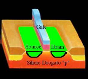 Un transistor MOS è costituito da un blocco di silicio drogato di tipo 'p', in cui sono ricavate due zone separate di tipo 'n', che costituiscono il Source (S) e il Drain (D). La zona tra S e D è la sede del canale di conduzione di cariche. Al di sopra del canale viene depositato un sottile strato di isolante e sopra viene depositato un elettrodo metallico che costituisce il Gate ( dispositivo di controllo ). Se il gate viene lasciato a potenziale zero, non vi è passaggio di corrente, mentre se viene reso sufficientemente positivo rispetto al source, il campo elettrico che si forma riesce ad attirare abbastanza elettroni nella zona sotto il gate, inducendo un canale n che collega S e D, permettendo così il passaggio di corrente.