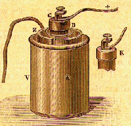 Nelle esperienze di magnetismo animale e nelle prove del suo 'telegrafo parlante', Meucci usò un gran numero di pile Bunsen del suo laboratorio di galvanostegia all'Avana (1844-1848) . Il dìsegno mostra una tipica pila Bunsen (C: anello di rame; D: vaso poroso; Z: lamina di zinco; V: vaso di porcellana; K: catodo)