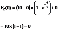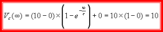 Istante t = 0 Si sostituisce questo valore nell'equazione che esprime la carica del condensatore. Si considera il condensatore scarico all'istante iniziale (il che equivale a dire che Viniz = 0), Il valore Vfin della tensione che il condensatore vede e che pertanto si stabilirà ai suoi capi a regime, è 10V. Si ottiene:
