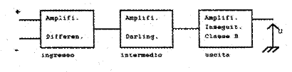- Lo STADIO DI INGRESSO è costituito da un amplificatore differenziale a due ingressi e una sola uscita; esso presenta un'elevata impedenza di ingresso e un guadagno non molto elevato. Lo stadio d'ingresso converte il segnale di tensione di ingresso in un segnale di corrente che viene inviato allo stadio intermedio.
