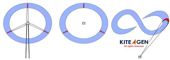 A clear advantage of this technology is visually suggested in the illustration below. The essence of the Kite Gen concept is comparable with a wind turbine, whose most efficient part are the wing tips - in red - where the highest speeds are reached; but only the truly needed components remain, high speed wings and the generator, the latter conveniently moved to the ground. The resulting structure, base foundation included, is much lighter and cheaper. Moreover the operative height can be adjusted according to wind conditions.