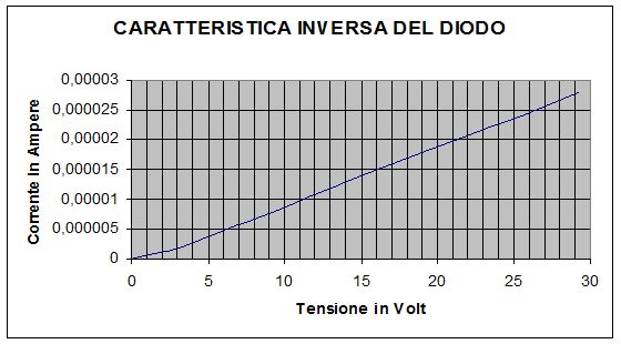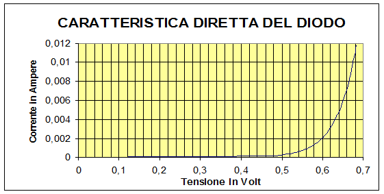 La caratteristica ( sia diretta che inversa ) viene presa nel seguente modo: si danno diverse tensioni in entrate facendo roteare la manopola dell'alimentatore. Nei display del voltmetro e dell'amperometro viene visualizzato, infine, la tensione ai capi del diodo e la corrente passante per esso. Utilizzando il software di calcolo Excell, si creano due colonne su cui vengono riportate la tensione e la corrente: con questi dati, infine, si è capaci di creare i grafici della caratteristica del diodo, i quali sono riportati nella pagina seguente.