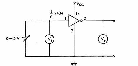Innanzitutto abbiamo esaminato attentamente il circuito elettrico disegnato e successivamente lo abbiamo realizzato sulla bread board. Come seconda cosa abbiamo posizionato l'integrato NOT LS 7404 sulla piastra millefori ed alimentato con una tensione costante di 5 volt. Contemporaneamente abbiamo erogato una tensione che variava tra 0 e 5 volt mediante l'ausilio di un generatore di tensione variabile, denominata tensione di entrata. In seguito abbiamo eseguito una serie di diciotto prove durante le quali immettevamo una tensione di entrata pari a dei valori prefissati inizialmente e poi tramite i puntali di un multimetro misuravamo l'entrata della porta NOT LS e il filo del collegamento a massa ricavando così la tensione di uscita della medesima porta, che diminuiva all'aumentare della tensione erogata dal generatore.