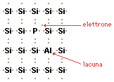 IL DROGAGGIO, un altro metodo per creare cariche libere in un cristallo semiconduttore è il drogaggio: si tratta di un trattamento che consiste nell'inserimento di piccolissime percentuali di materiali (impurità o droganti) dotati di tre o cinque elettroni di valenza (i semiconduttori ne hanno quattro). Ogni atomo di drogante sostituisce, nei legami covalenti, un atomo di semiconduttore. Se il drogante ha cinque elettroni, uno di essi resta libero per la conduzione: il drogante si dice 'donatore' e il semiconduttore, così drogato, è detto di tipo n, poiché in esso prevalgono portatori di carica negativi (gli elettroni). Se il drogante ha solo tre elettroni di valenza, il legame covalente è incompleto e nel reticolo cristallino genera una lacuna: il drogante si dice 'accettore' e il semiconduttore drogato è detto di tipo p, poiché in esso prevalgono portatori di carica positivi (le lacune). Questo concetto è illustrato dallo schema, che mostra un cristallo di silicio (Si) drogato. I quattro elettroni di valenza di ogni atomo sono rappresentati da punti. Nel cristallo con drogaggio di tipo n alcuni atomi di fosforo (P), che hanno cinque elettroni di valenza, sostituiscono altrettanti atomi di silicio, liberando un elettrone ciascuno. Nel cristallo con drogaggio di tipo p sono inseriti atomi di alluminio (Al), che hanno tre elettroni di valenza; ciascun atomo di Al, a cui manca un elettrone per realizzare un legame covalente completo, costituisce una lacuna. Si ottiene, in ogni caso, un aumento della conducibilità.