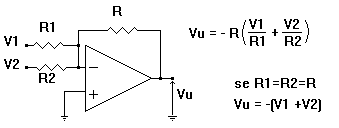 Un altro circuito spesso usato è il sommatore invertente la cui uscita Vu è legata alla somma dei due (o più) ingressi V1 e V2.
