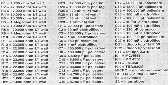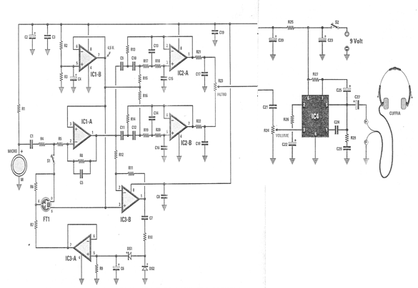 Il segnale captato dal microfono viene trasferito tramite il condensatore C1 e le due resistenze R4-R5 sul piedino 2 invertente dell'operazionale siglato IC1/A.
