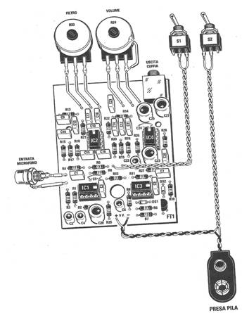 Per completare il montaggio sarà necessario saldare degli spezzoni di filo isolato sui terminali presenti sul circuito stampato, dove andranno poi fissati i due potenziometri, gli interruttori e la presa femmina per l'ingresso del segnale microfono, dopo di che collegare il microfono, la pila e gli interruttori S1 - S2.