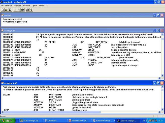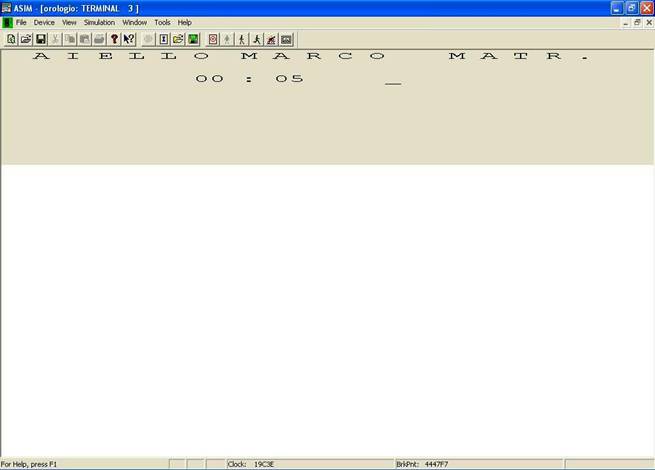 Successivamente si sceglie la finestra "M68000" e dal menù "Proc Unit" si sceglie la voce "load assembler" caricando così il file "orologio.lis" , successivamente dal menù "simulation" scegliendo l'opzione "run" , il programma è mandato in esecuzione e dalla finestra "TERMINAL" è possibile osservare la comparsa della scritta scorrevole e dell'orario :