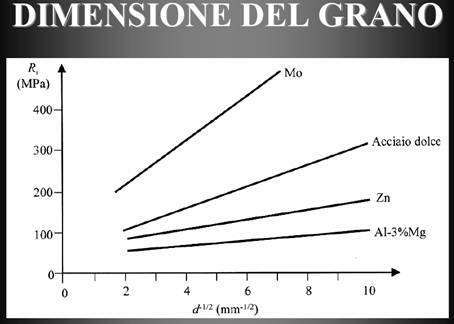 dimensione del grano: vediamo non solo l'acciaio ma diversi materiali. il grafco riporta in ascisse la dimensione del grano e più vado avanti e più il grano è piccolo, sulle ordinate o la resistenza allo snervamento.