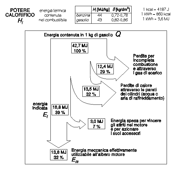 tra l'energia meccanica prodotta Ei e la quantità di calore prodotta dalla combustione Q . In un diesel, i = 0,36 ÷ 0,40, in un motore a scoppio i