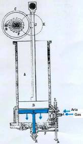 In questa fase si muove solo lo stantuffo ausiliario 'G', che scende aspirando aria e gas combustibile, rispettivamente dalle luci 'a' e 'd'.