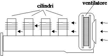 Il raffreddamento ad aria (Figura 25) si ottiene applicando una apposita alettatura alle pareti dei cilindri, che cede calore all'aria mossa da una ventola (la velocità dell'aria deve essere almeno 50- 70 km/h). Costruttivamente semplice e poco soggetto a guasti, il raffreddamento ad aria consente un più rapido riscaldamento del motore all'avviamento ma è piuttosto rumoroso.