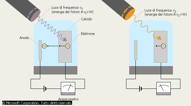La radiazione luminosa di frequenza í è composta da particelle corpuscolari (fotoni) di energia E = h*í (h è la costante di Planck). Per riuscire a strappare un elettrone a una superficie metallica, l'energia del fotone deve essere maggiore dell'energia di legame dell'elettrone nel metallo (W). In questo caso, inserendo un amperometro fra anodo e catodo si misura un passaggio di corrente (a sinistra, nell'illustrazione). Se l'energia del fotone è inferiore a W (a destra, nell'illustrazione) non si ha effetto fotoelettrico, e dunque l'amperometro non registra flusso di corrente. La caratteristica importante dell'effetto fotoelettrico è di dipendere dalla frequenza della radiazione, che determina l'energia del fotone, e non dall'intensità della luce.