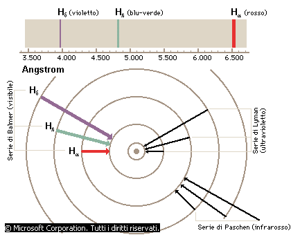 Quando un elettrone compie una transizione da un livello energetico a un altro, l'atomo emette fotoni di una particolare energia, osservabili sotto forma di riga di emissione mediante uno spettroscopio. Nell'atomo di idrogeno, la serie di Lyman raggruppa le transizioni allo stato fondamentale, la serie di Balmer, nella regione del visibile dello spettro, comprende le righe relative alle transizioni al secondo livello energetico e quella di Paschen, nell'infrarosso, quelle al terzo livello.