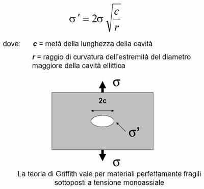 Per griffith questa discrepanza è attribuibile alla presenza di difetti nel materiale (pori, micro fessure) che producono delle sollecitazioni localizzate (σ') notevolmente superiori alla tensione media (σ).
