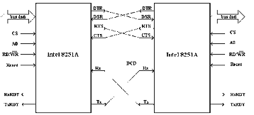 Uno dei requisiti del progetto consiste nel fare in modo che le due USART funzionino utilizzando una connessione asincrona e che utilizzino il protocollo di handshaking. Il modo di funzionamento asincrono è realizzato ponendo ad 1 l'ultimo bit del registro mode, che rappresenta il registro che per primo si accede dopo che il dispositivo è stato acceso.