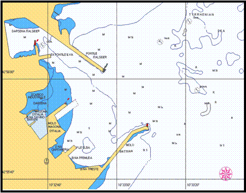 Il porto di Piombino (Figura 1-1.) ha una profondità che varia tra 2 e 13 metri, presenta un bacino delimitato a Sud-Est dal molo sopraflutto, detto Batteria (Figura 1.-1- a), ed a Nord-Est dal pontile Italsider (Figura 1-1-b . Nella parte interna del porto si distinguono tre strutture: il pontile Magona (Figura 1-1-c , con due accosti da 104 metri a nord e 120 metri a sud, la banchina Trieste (Figura 1-1-e) con fascia operativa di 160 metri e l'alto fondale che permette l'accosto di navi fino a 110 metri e la banchina Marinai d'Italia" (Figura 1-1-d) che è stata completata nell'agosto 2002, tale struttura è lunga 125 metri, con fondale di 8,5 metri, ed ha la funzione di potenziare le strutture destinate al traffico commerciale. L'ultima opera di recente ultimata, sempre a tale scopo, è il prolungamento del molo Batteria (Figura 1-1-a) di 280 metri con l'ampliamento fino a 25 metri, consentendo così l'attracco di navi commerciali di grande stazza.