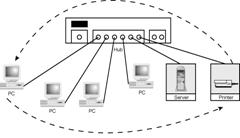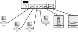 Star topology LANs have connections to networked devices that radiate out from a common point--that is, the hub, as shown in Figure 4. Unlike ring topologies, physical or virtual, each networked device in a star topology can access the media independently. These devices have to share the hub's available bandwidth. An example of a LAN with a star topology is Ethernet.