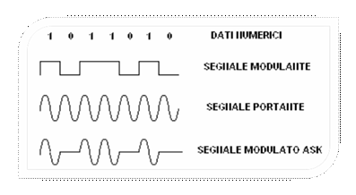 Nella modulazione ASK il segnale digitale, che costituisce l'informazione da trasmettere, va a modulare una portante sinusoidale facendone variare l'ampiezza in modo da far corrispondere all'uno logico la portante stessa e allo zero logico, l'assenza di portante.