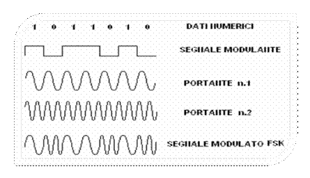 Nella FSK si hanno due possibili portanti a frequenze diverse che vengono abbinate ai due valori logici binari uno e zero.