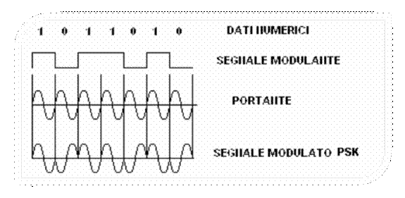 La modulazione numerica più moderna p certamente la PSK nella quale si ha una sola portante e quindi i due valori numerici uno e zero vengono fatti corrispondere a due fasi diverse della stessa frequenza: 0° e 180° rispettivamente