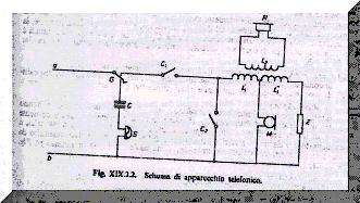 In Fig. č riportato lo schema di un apparecchio telefonico a disco;esso č collegato alla centrale, e quindi agli altri utenti, tramite il doppino telefonico, costituito dai fili a e b. Il microfono M ed il ricevitore R fanno parte di un insieme detto microtelefono; L1', L1'', L2, e Z costituiscono il circuito antilocale, che ha lo scopo di impedire a chi parla di sentire la propria voce al ricevitore.