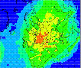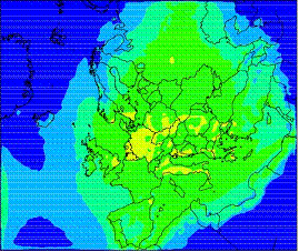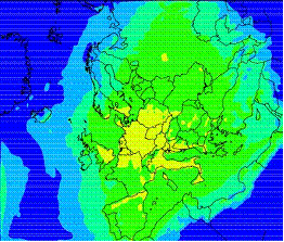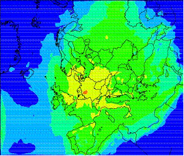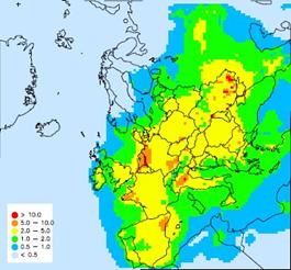 Fig. 7 Distribuzione spaziale in aria di ammonio gassoso e particolato in Europa Europa (mg Nm-2) (EMEP, 2004). |
