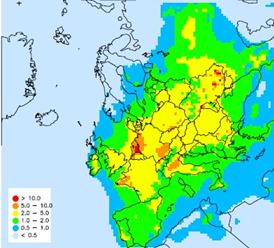 Fig.6 Deposizioni di ossidi di azoto in Europa (mg Nm-2) (EMEP, 2006). |
