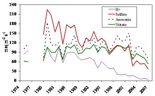La maggiore riduzione si è verificata a partire dai primi anni '90, grazie alla ripresa economica dell'est europeo. La diminuzione nelle emissioni ha avuto come risultato quello di ridurre i livelli di inquinamento atmosferico e, nel complesso, ambientale. La riduzione di solfato in aria e nelle deposizioni, che ha portato ad un incremento del pH delle piogge, è diminuita anche se non altrettanto marcatamente come le emissioni (Fig.5).