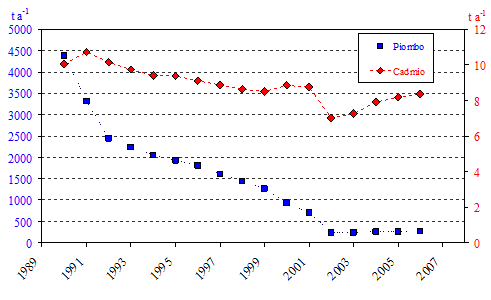 I trend relativi alle emissioni antropiche di piombo, cadmio e mercurio nel periodo 1990-2006 sono indicati nella figura 8, dove si nota una riduzione per tutti e tre i metalli, rispettivamente dell'88% per piombo, 50% per cadmio e del 46 % per il mercurio. Si stima una ulteriore potenziale di riduzione relativo alle emissioni fino al 2010 pari circa al 40% per cadmio, cromo e nichel e di circa il 57% per piombo (Pacyna et al., 2007).