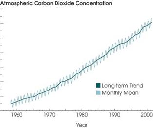 Come si evince dal grafico, tra tutti i gas serra, l'anidride carbonica è la più importante ai fini del riscaldamento globale: è infatti dotata di una lunghissima vita media (50-200 anni). Per questo motivo dal 1958 la concentrazione di anidride carbonica nell'atmosfera viene regolarmente controllata, con misure effettuate alla sommità del vulcano Mauna Loa, nelle isole Hawaii. Da allora la percentuale di anidride carbonica è nettamente aumentata, al ritmo di circa 1,5 ppm (parti per milione) ogni anno, che equivalgono a 3-3,5 miliardi di tonnellate di carbonio ogni anno.