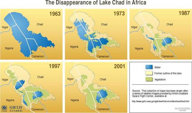 Il riscaldamento globale, causando un' evaporazione maggiore dagli oceani, alimenta le nubi prosciugando nel contempo tutta l'umidità del suolo. Questa evaporazione è aumentata considerevolmente portando ad un innalzamento delle temperature e non solo aumenta le precipitazioni ma le sposta e il fenomeno si concentra soprattutto in Africa, al limite del Sahara, in cui si accentua il fenomeno della siccità, come sta già accadendo in Niger, Ciad, Camerun e Nigeria. Il lago Ciad, tra questi due Paesi, è quasi prosciugato.