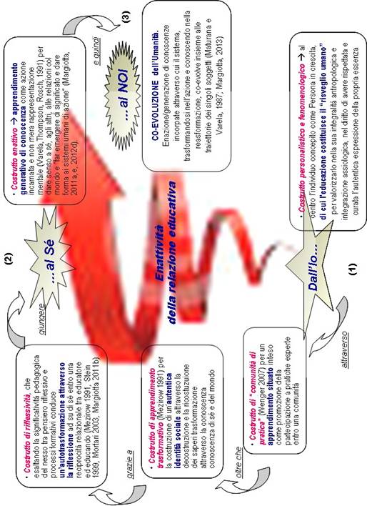 ripreso da Varela, secondo cui la conoscenza viene acquisita per tramite dell'azione. Dunque non più cognizione come rappresentazione - cioè manipolazione astratta di simboli realizzata da una mente scissa dal corpo - bensì cognizione come azione nell'ambiente e sull'ambiente (embodied cognition) generativa - cioè enattiva - di trasformazione e di una contestuale co-evoluzione del sistema individuo-ambiente. Secondo questa visione il sistema apprende mentre si trasforma attraverso l'azione (che è corporea) e conosce perché si trasforma; nel contempo, si trasforma perché conosce. La lezione che si ricava è che "la dimensione evolutiva della embodied cognition porta a dire che come non esiste una mente che governa il corpo ma entrambi - corpo e mente - dialogano per produrre costantemente uno spostamento in avanti degli orizzonti e per allargare i mondi di esperienza (ed è questo che fa la coscienza), altrettanto diventa decisivo per l'educazione configurarsi in questi termini. In accordo con Margiotta (2013) ciò vuol significare che non c'è relazione educativa se non c'è autoformazione.