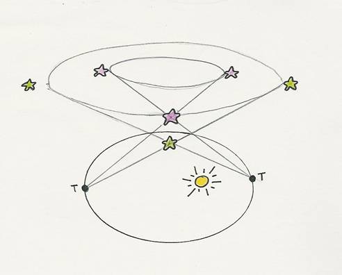 stesso accade nella parallasse, solo che il dito rappresenterà la stella e