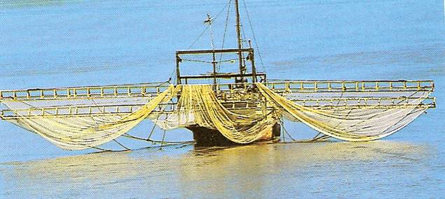 Sopra, un'imbarcazione marittima per la pesca dei gamberi, chiamata "barca a farfalla" per la caratteristica rete che forma due ali.