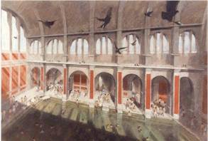 The art and engineering of the remarkable baths at Minerva's temple offer us a glimpse of Roman Britain at its most glorious. The complex housed was completed in the 4th century AD. An elaborate hypocaust heating system serviced a series of hot sweat rooms; swimming pools and rooms which cooled the pilgrims down. The Great Bath was at the centre whit its own hall. Surrounded by the gods, whose statues emerged mysteriously from the swirling steam, the Great Bath must have seemed a wonder of the ancient world.