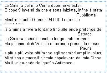 Testo pieno di dichiarazioni di poetica. Saluta la pubblicazione di un epillio pubblicato da Evio Cinna, neoterico. Smyrna è il titolo del poemetto, e prende il nome dalla protagonista. Le sue dimensioni erano ridotte, e narrava un mito fuori dagli schemi: amore incestuoso di Mirra per il padre, da cui nascerà Adone. Durante l'ellenismo il mito non è più paradigma, ma curiosità e sfoggio di erudizione; si ricercano miti rari e particolari. La Smyrna appariva un po' come un manifesto del neoverismo. Nell'ambiente catulliano tutti gli eventi del "circolo" vengono vissuti intensamente, così come dimostra il carmen. In questo saluto egli ha modo di precisare quali sono i suoi canoni eccellenti, e lo fa tramite opposizioni: contrapposizione tra Smyrna (scritto in 9 anni) e un certo Ortensio (forse Ortensio Ortalo, che scrisse un poema molto lungo), che compose in un solo anno 500000 versi (forse iperbole). Nella prima parte la contrapposizione è a livello della cura formale.Nella seconda parte (vv.5-8) la contrapposizione avviene sulla base della fama: il modello eccellente Smyrna e gli annales di Volusio. Verso 5: la fama della Smyrna si estende a livello spaziale; nel verso 6 la sua fama si estende nel tempo. Nei versi 7 e 8 torna lo spazio (v.7), riferito però agli Annales di Volusio, e il tempo (v.8) (i rotoli degli Annales non verranno usati se non per "far da cartoccio agli sgombri"). L'opera di Cinna è contrapposta a quella di Antiloco di Colofonie, noto per essere molto pesante. È forse l'iniziatore della poetica ellenistica. La contrapposizione tra Cinna e Antimaco è sulla base del gusto: raffinatezza quando si parla di Cinna, gonfiezza quando parla di Antiloco. Il testo è scandito dall'anafora+ poliptoto di Smyrna, sempre in posizione iniziale.