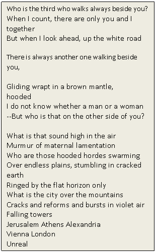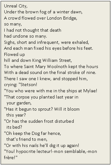 T.S. Eliot is considered one of the main exponents of Modernism. His poem expresses the spiritual and moral confusion of "The Age of anxiety". Eliot underlines the importance of the collective dimension of culture; like Dante, feels the disintegration of an age.