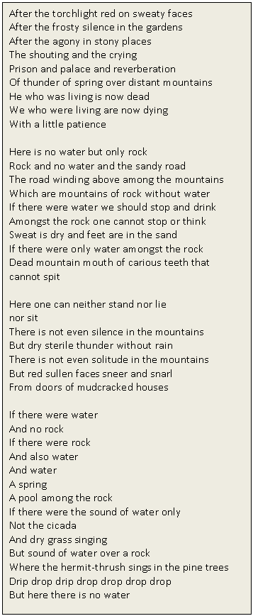 We have two desolated images to describe a world, that is barren and empty, populated by ghosts and sense of nonentity. London in an "unreal city": men are shades of corpses, they cannot speak. There is a reference to Dante: the poet turns to a dead, Stetson. The corpse planted in the garden represents the bad conscience, that doesn't succeed in blooming and in giving goods fruits. While the dog (that is friend to man) tries to indicate the correct street to the human conscience. In Eliot we find the same sensation of Baudelaire: Eliot advises the decadence of an epoch. In fact not only in the urban circumstance life acquires the semblances of death: the waste land is expanded to the mountain, where there is not luxuriant vegetation, but arid drought. The image of inanimate rock is the objective correlative of death and is in relation with the incessant absence of water, symbol of regeneration and life. The sandy road underline the condition of desert of reality and existence. The whole nature is abandoned to corrosion and degradation.