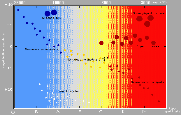 Gli scienziati hanno individuato due metodi principali di classificazione per le stelle. Essi sono la magnitudine (la loro luminosità) e le classi spettrali (il loro calore superficiale). Questi due metodi sono stati assemblati dai fisici Hertzsprung e Russel in un diagramma, chiamato appunto diagramma H-R dai loro nomi, che era in grado di classificare le stelle secondo entrambi i metodi (posti in ascissa e in ordinata del diagramma). Inserendo i dati di vari esperimenti nel diagramma, come primi risultati i due fisici trovarono due gruppi di stelle: il primo in basso a sinistra, chiamato con il nome di nane bianche, e il secondo in alto a destra (le giganti). Le nane bianche erano quindi stelle piccole, o poco luminose, ma molto calde, mentre le giganti erano stelle particolarmente luminose ma relativamente fredde. In seguito essi scoprirono che le stelle non si disponevano nel diagramma casualmente, ma che formavano, oltre ad alcuni gruppi separati (giganti rosse, supergiganti, nane bianche e sub-nane), una diagonale, chiamata sequenza principale. Sulla sequenza principale si posizionano tutte quelle stelle che si trovano in una condizione di stabilità, cioè nelle quali si stanno compiendo delle fusioni nucleari. Il diagramma H-R assume una funzione fondamentale in quanto è in grado di racchiudere in sé tutte le fasi dell'evoluzione stellare. Le stelle con massa pari a quella del Sole si formano da globuli di materia relativamente fredda, i globuli di Bock, mentre le stelle massicce hanno origine da un'instabilità gravitazionale nella materia interstellare provocata da onde d'urto. Si forma in entrambi i casi una protostella, cioè una nube di gas nella quale le particelle di materia sono legate tra loro da interazioni gravitazionali (che farebbero contrarre la protostella) le quali convivono con la tendenza all'espansione del gas che si riscalda. Prevalendo la forza gravitazionale, la nube si contrae, facendone aumentare densità e temperatura. Quando la temperatura del nucleo stellare raggiunge i 10 milioni di gradi, viene innescata a fusione nucleare dell'idrogeno in elio, e la stella appena creatasi si inserisce nella sequenza principale del diagramma, sul quale è possibile seguirne l'evoluzione a seconda della massa. Durante il periodo della permanenza sulla sequenza principale (periodo di stabilità) si realizza l'equilibrio tra la forza gravitazionale e la pressione di radiazione (diretta dal nucleo verso l'esterno). Quanto più è massiccia la stella, quanto più rapidamente consuma l'idrogeno e quindi staziona meno sulla sequenza principale. Quando l'idrogeno diminuisce, la fusione nucleare si sposta nello strato intorno al nucleo; l'equilibrio si rompe e la parte centrale si contrae e si riscalda. Il calore prodotto viene dissipato dalla stella con l'espansione dello stato più esterno: essa si sposta dalla sequenza principale al gruppo delle giganti rosse. La contrazione ricomincia fino al raggiungimento di una temperatura pari a 100 milioni di gradi con l'innesco della fusione nucleare dell'elio in carbonio. La nuova pressione di radiazione prodotta dalla fusione riporta ad un equilibrio, perciò la stella torna sulla sequenza principale. È però uno stato instabile con variazioni periodiche di luminosità (variabile intrinseca).