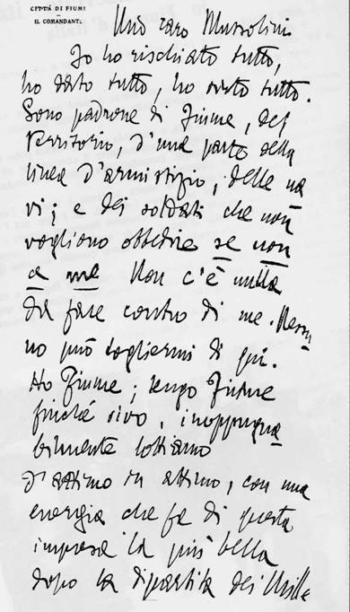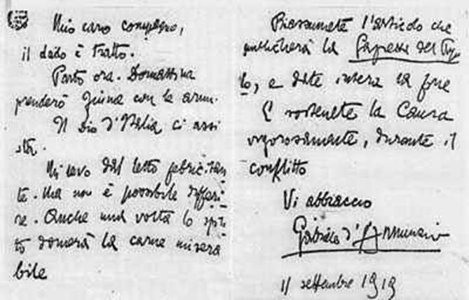 "Mio caro compagno, Il dado è tratto. Parto ora. Domattina prenderò Fiume con le armi. Il Dio d'Italia ci assista. Mi levo dal letto febbricitante. Ma non è possibile differire. Ancora una volta lo spirito domerà la carne miserabile. Riassumete l'articolo che pubblicherà la Gazzetta del Popolo e la fine e sostenete la causa vigorosamente, durante il conflitto. date intera