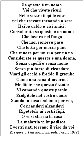 Questa poesia, terribile e intensa, racchiude in sé tutta la ragione dello scrivere di Primo Levi: testimoniare. E' un «Voi» potente quello che riecheggia nei primi versi, un "Voi" che sottintende lo stato di diversità. di distacco che caratterizza chi non è stato tra i dannati della terra, chi non può sapere. Così tutti i versi successivi, retti da quel condizionale «se»; tutte le proposizioni relative, che scandiscono le terribili tappe della vita nei lager, altro non sono se non il tentativo di rendere con le parole ciò che le parole non possono esprimere.