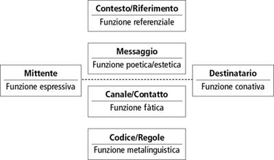 Arricchendo la definizione, Jakobson schematizza sei elementi fondamentali di una comunicazione, distinguendo un mittente (o locutore, o parlante) che è colui che invia un messaggio all'ascoltatore (o interlocutore o destinatario). il messaggio non si esplica solo attraverso la forma, ma è anche portatore di contenuti, che Jakobson definisce contesto (o co-testo, "che va insieme al testo", in pratica ciò che il testo tratta). Il messaggio dev'essere formulato attraverso un codice (un sistema di segni, in genere una lingua) che risulti comune sia al mittente sia al destinatario, e un contatto che è al tempo stesso un canale fisico e una connessione psicologica fra il mittente e il destinatario, che consente loro di stabilire la comunicazione e di mantenerla.