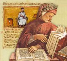 Foto di Primo Levi e Ritratto di Dante Alighieri, affresco di Luca Signorelli, Cappella di San Brizio nel Duomo di Orvieto; alle sue spalle, un'immagine di Virgilio, codice detto "Virgilio Romano", V secolo d.C., Biblioteca Apostolica Vaticana, Città del Vaticano.