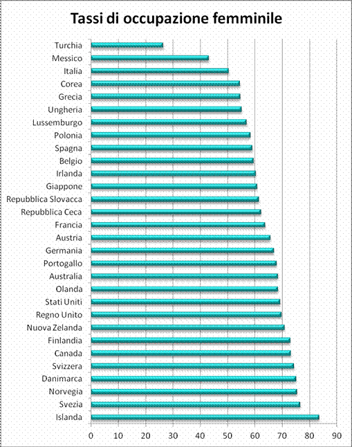 Nel nostro Paese circa la metà delle donne in età lavorativa non partecipa alla vita economica: si tratta di 9 milioni 600 mila persone, di cui un terzo - che corrisponde a 3 milioni 250 mila donne - è nella fase centrale della vita (35-54 anni). Gli uomini inattivi sono meno di 5 milioni - quindi 4 milioni e mezzo meno delle donne - e di questi soltanto 580 mila sono nella fascia di età centrale. Questi dati delineano la situazione dell'Italia, che ha il più basso livello di partecipazione femminile al mercato del lavoro tra tutti i 25 stati membri dell'Unione Europea, e che figura al terzultimo posto tra i 30 paesi aderenti all'Organizzazione per la cooperazione e lo sviluppo economico (Ocse). Secondo i dati diffusi da quest'organo nel 2005 il paese con il più alto tasso di attività femminile è l'Islanda dove la quota di donne attive oltrepassa l'83% seguita dai Paesi scandinavi. L'Italia è al 28° posto con il 50,4% di popolazione femminile attiva. Dopo l'Italia troviamo Grecia, Messico e Turchia.
