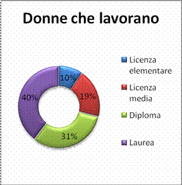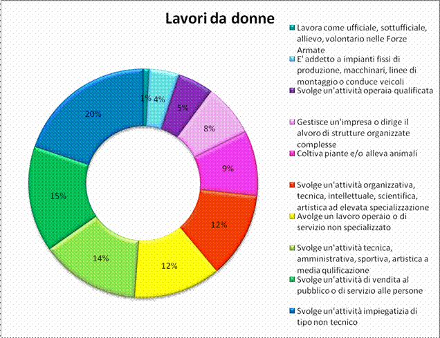 Le donne che lavorano sono in misura minore rispetto agli uomini ma che lavori svolgono? Prevalentemente quei lavori che la mentalità italiana considera da donne ma anche quei lavori tipicamente maschili che hanno suscitato molto scandalo. Le donne continuano ad affermarsi un po' in tutti i settori dimostrando di valere veramente, e molto spesso anche di più degli uomini.
