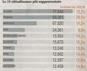 Non é possibile sapere con certezza quanti siano gli immigrati presenti nel nostro paese, poiché a quelli che hanno ottenuto la cittadinanza e a quelli provvisti di regolare permesso di soggiorno, vanno aggiunti i "clandestini", cioè coloro che sono costretti a nascondersi e risultano quindi sconosciuti agli uffici anagrafici. Gli immigrati per la maggioranza provengono dall'Africa del Nord, Asia, America Latina e paesi dell'Europa orientale ( Albania, ex Jugoslavi, Polacchi e Rumeni).