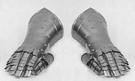 È formata da piastre che proteggono e seguono il movimento delle dita. Alla manopola era fissato un guanto interno di cuoio. Al bordo era incernierata la piastra a protezione del pollice. I guanti a piastra proteggevano le mani molto meglio della maglia metallica, in quanto erano più solidi e non si flettevano non appena ricevevano un colpo.
